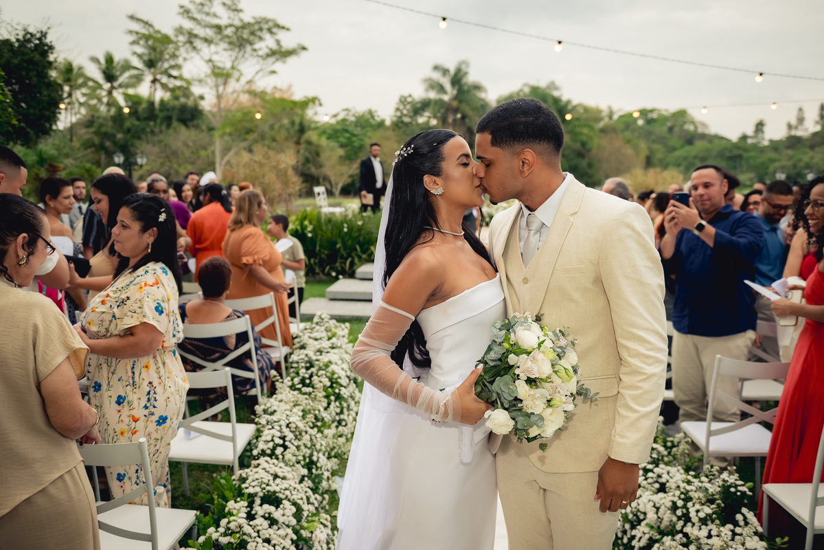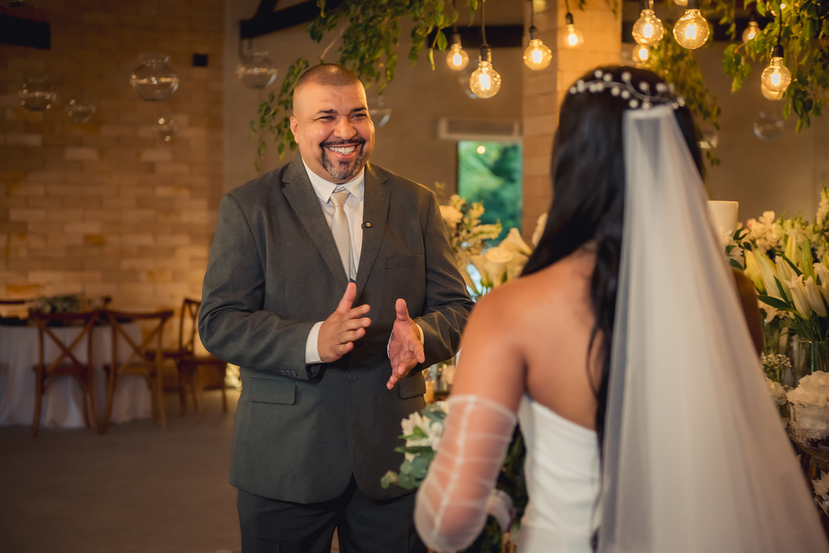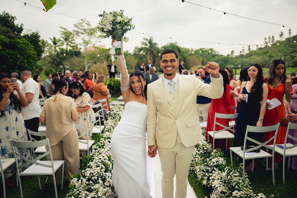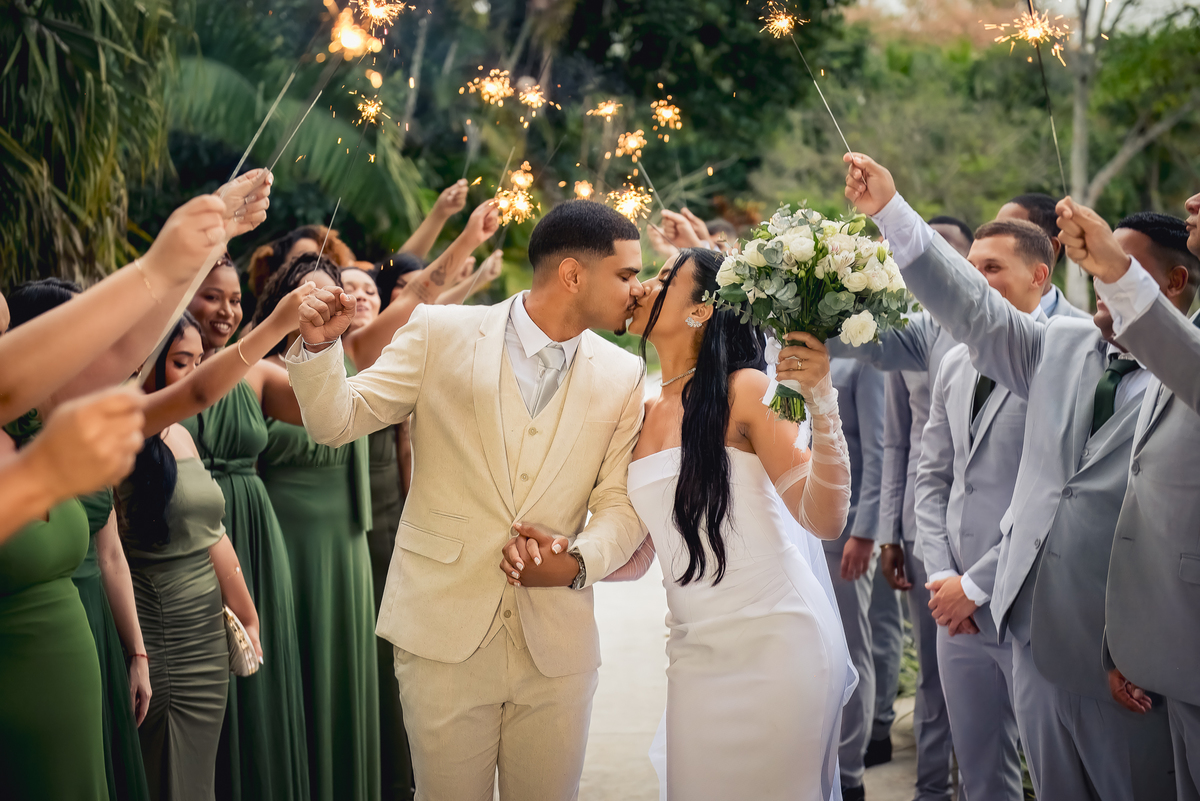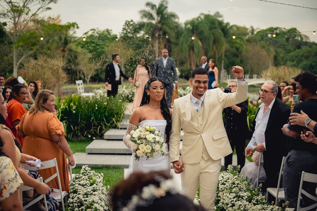 Durante a saída dos noivos, o cerimonialista Adriano Costa, junto com suas assessoras, organizou o túnel de sparkles com os padrinhos e os noivos passaram com grande alegria.